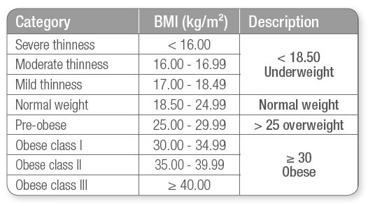En adultos el valor calculado deberá ser de entre 18,5 y 24,9 kg/m². Cuando el valor supera los 30 kg/m² se habla de obesidad.