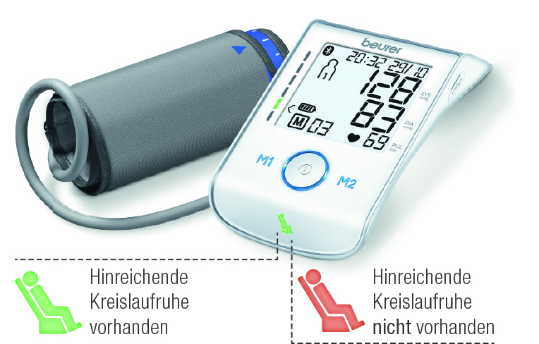 Um das zu vermeiden, hat das FIMT Asperg für Beurer den sogenannten Ruheindikator entwickelt. Der patentierte Ruheindikator garantiert eine präzise Blutdruckmessung, indem er die Zeitintervalle der Pulsschläge misst. Am Verlauf der Pulswelle und deren Verlauf während der Messzeit stellt das Blutdruckmessgerät während der Messung fest, ob sich die messende Person in einem ausreichenden Ruhezustand befindet.