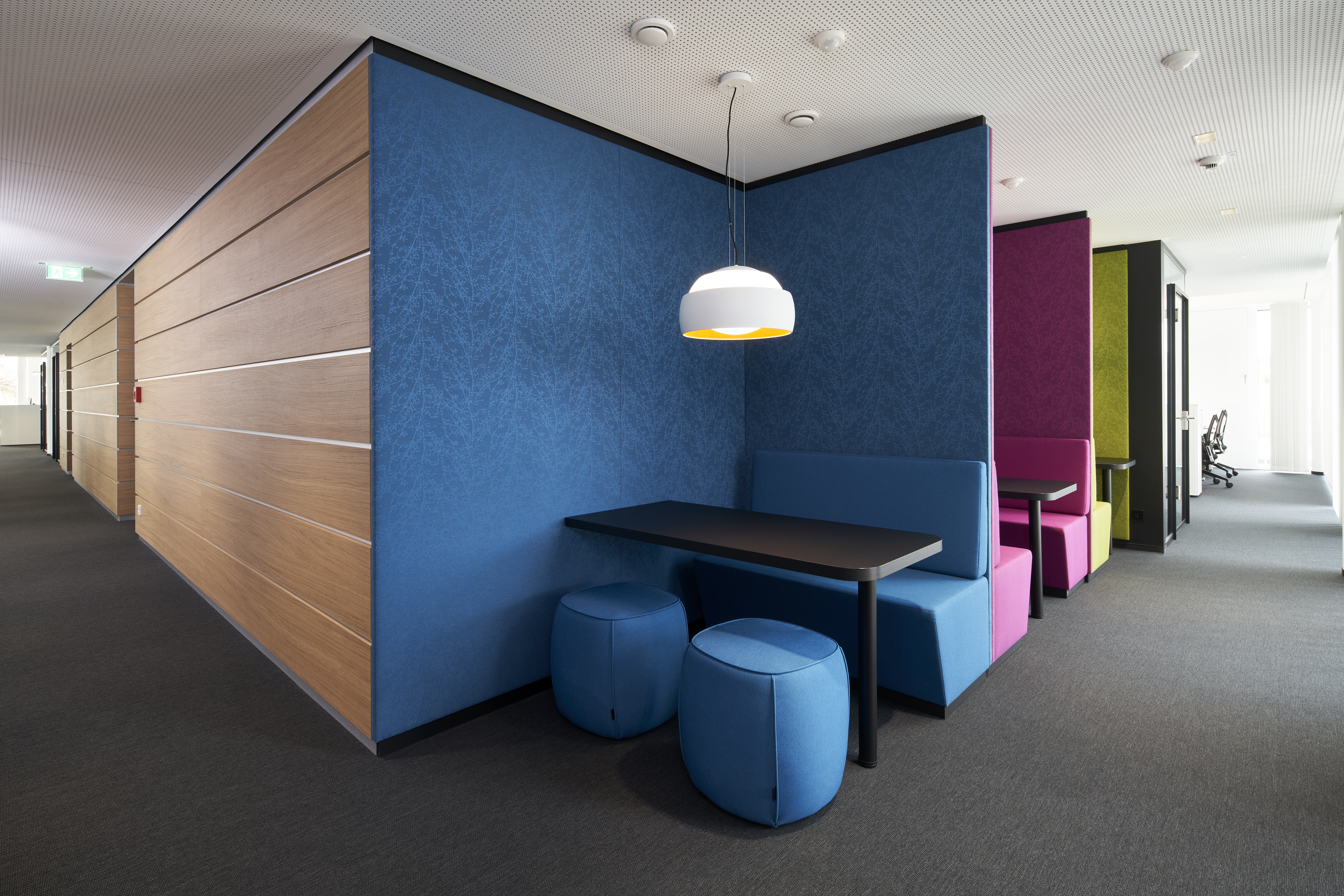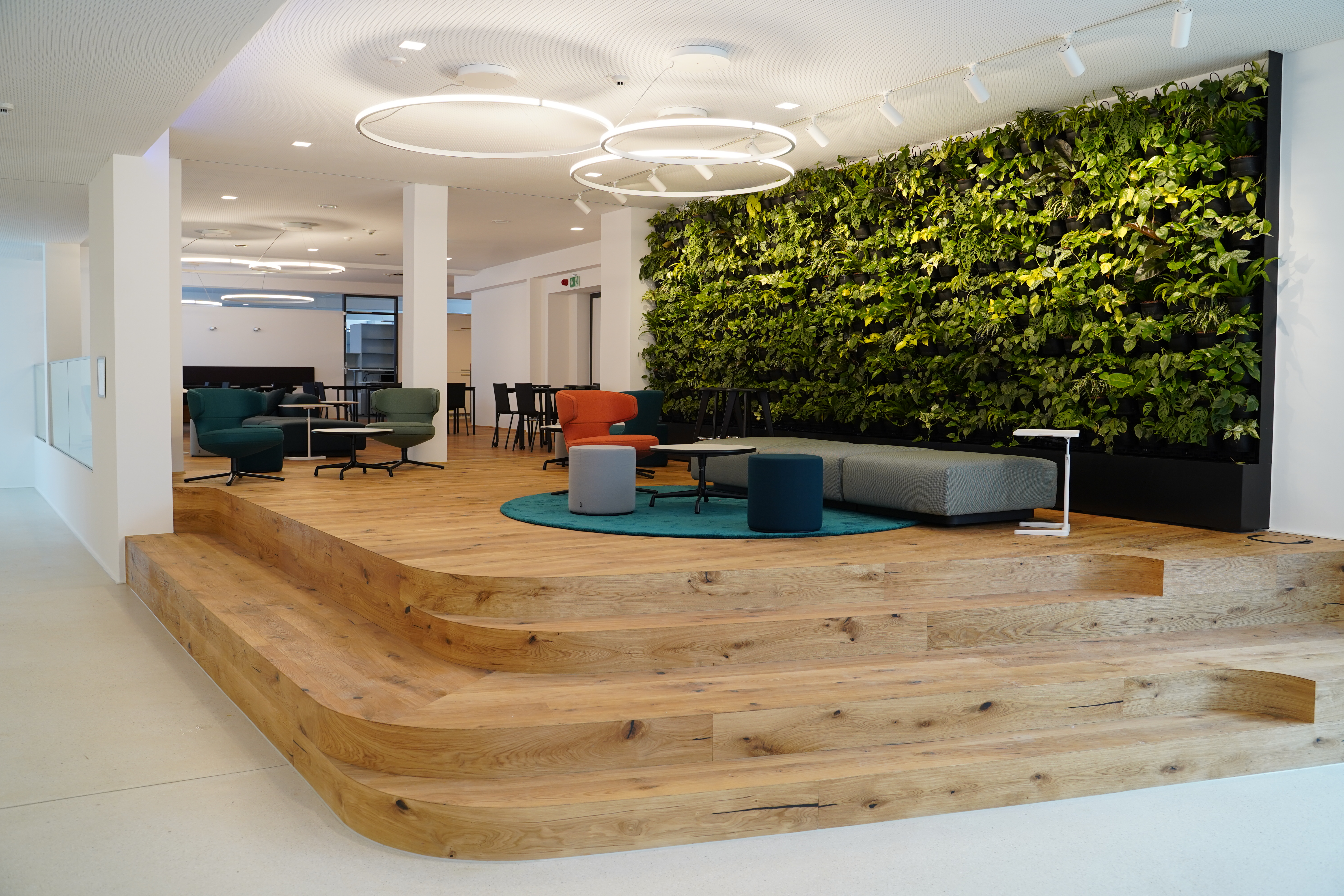 Das neue Verwaltungsgebäude mit 2800 m2 Nutzfläche bietet viel Raum für kreative Ideen. Die Verbindung von Tradition und Innovation spiegelt sich im gesamten Gebäude wider. So ist die Innengestaltung hell, freundlich und zeitlos, die Gebäudetechnologie nach modernstem „State of the Art" ausgestattet. Neben Büroräumen und mobilen Arbeitsplätzen gibt es einen neuen Haupteingang mit Empfangsbereich und einen großen Showroom zur Produktpräsentation. Weiterhin laden großzügige Schulungs- und Meetingräume sowie Kreativ-Inseln zum Austausch mit den Kollegen ein. Fokusräume bieten wiederum Rückzugsmöglichkeiten für Online-Meetings oder Ruhearbeit. Im hauseigene Coffice werden Kaffeespezialitäten und Snacks angeboten. Zwischendrin finden sich aber auch immer wieder Anekdoten und Zeitzeugnisse der mehr als 100-jährigen Beurer Geschichte, wie eine Historienwand oder der nach der Gründerin benannte „Käthe-Beurer-Platz" mit Statue zu Ehren des Gründer-Ehepaars.
